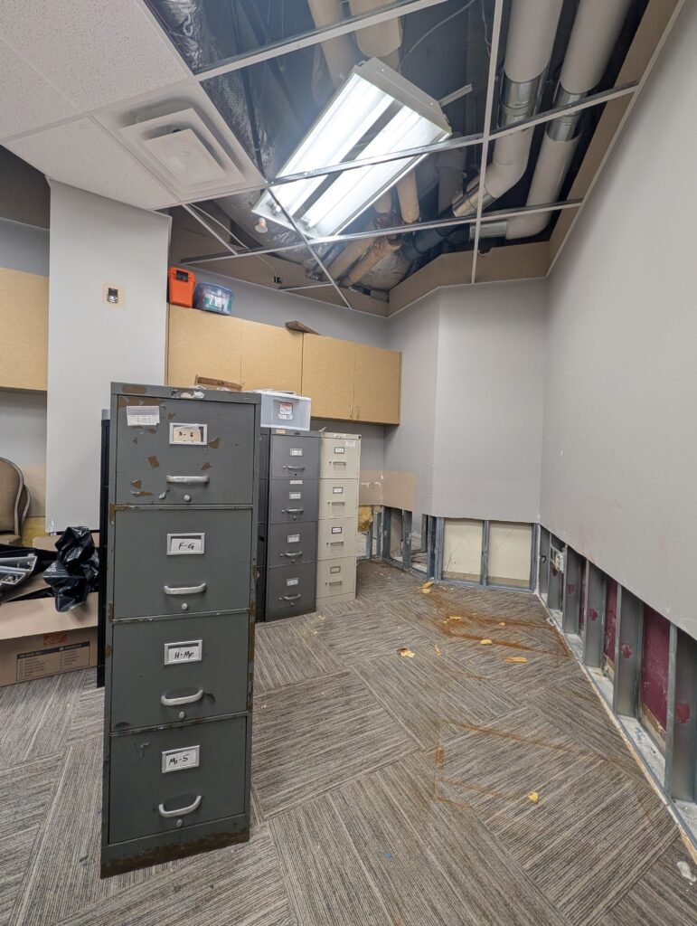 At approximately 5:30 pm Thursday, February 19, 2026, a sprinkler pipe burst in our building. The alarm was triggered immediately, but unfortunately the first and second floors sustained significant flooding before the water could be shut off. Water remediation began immediately.